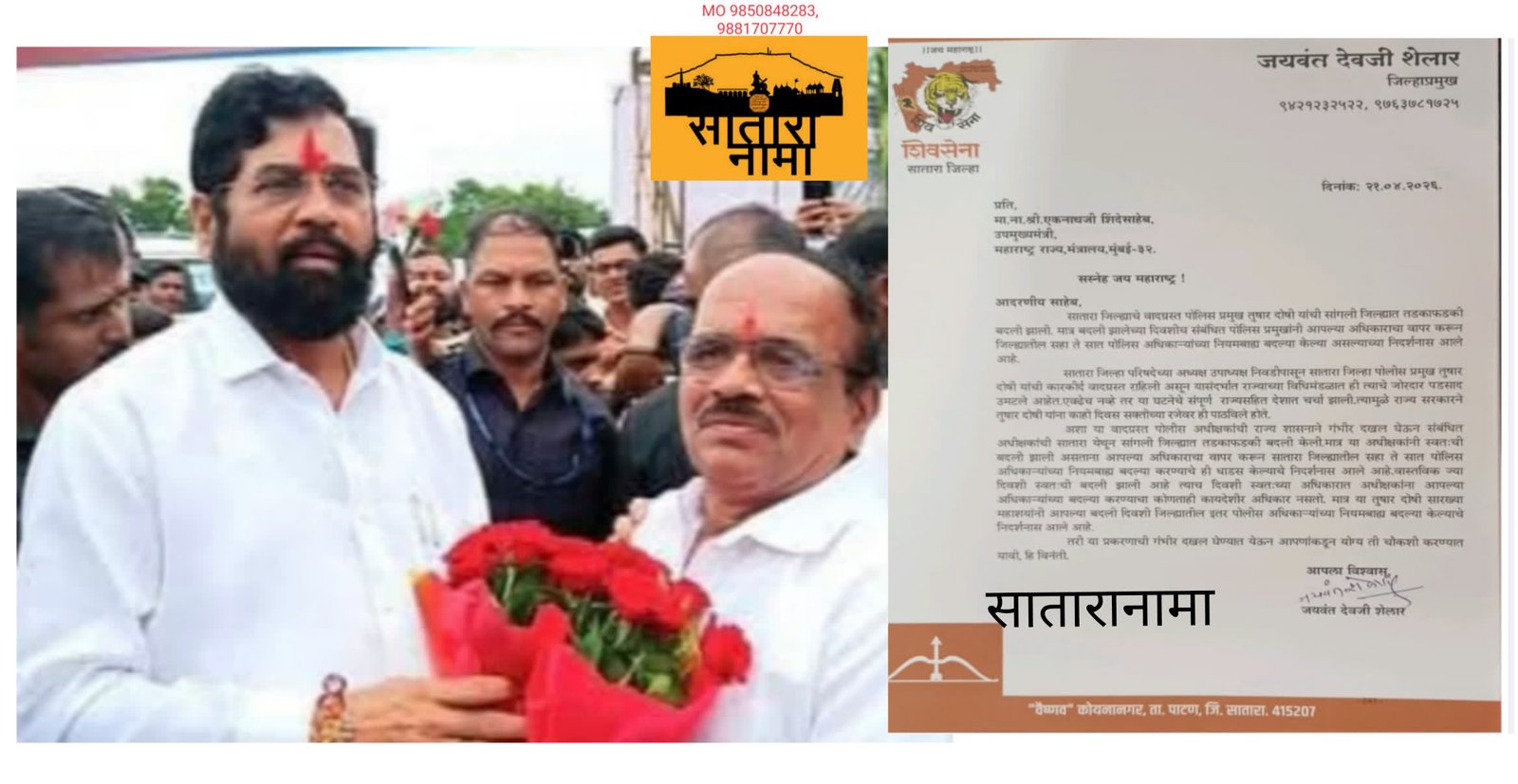 सातारा जिल्ह्याचे वादग्रस्त पोलिस प्रमुख तुषार दोषी यांची सांगली जिल्ह्यात तडकाफडकी बदली झाली मात्र बदली झालेच्या दिवशीच संबंधित पोलिस प्रमुखांनी आपल्या अधिकारात जिल्ह्यातील सहा ते सात पोलिस अधिकाऱ्यांच्या नियमबाह्य बदल्या केल्या.या नियमबाह्य बदल्याबाबत सातारा जिल्हा शिवसेना राज्याचे उपमुख्यमंत्री ना एकनाथ शिंदे यांचेकडे निवेदन देऊन राज्याच्या पोलिस महासंचालकांकडे तक्रार दाखल दाखल केली आहे.