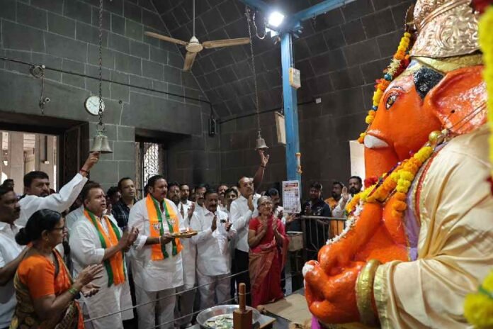 वाई : खासदार उदयनराजे भोसले यांनी वाई शहरात प्रचार फेरी काढण्यापूर्वी घाटावरील महागणपतीचे दर्शन घेतले. याप्रसंगी मोठ्या संख्येने कार्यकर्ते त्यांच्यासोबत गणेश आरतीसाठी सहभागी झाले होते.