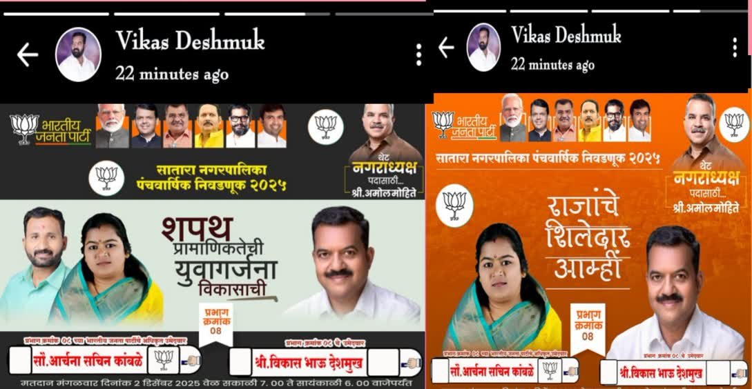 सार्वजनिक बांधकाम मंत्री शिवेंद्रसिंहराजे भोसले यांच्या समर्थक व सध्या अपक्ष उमेदवार असलेले विकास देशमुख व अर्चना कांबळे यांच्याकडून भाजपच्या चिन्हा च व नेत्यांचे फोटो टाकून प्रचार सुरू सार्वजनिक बांधकाम मंत्री कारवाई करणार का याकडे सातारकरांचे लक्ष