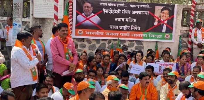 राष्ट्रवादीचे कॅबिनेट मंत्री नवाब मलिक यांचा राज्य शासनाने तत्काळ राजीनामा घ्यावा या मागणीसाठी भाजपा सातारा जिल्हा कार्यकारिणीच्या कार्यकर्त्यांनी सातारा जिल्हाधिकारी कार्यालयावर जोरदार निदर्शने केली बहुसंख्य आंदोलकांनी जिल्हाधिकारी कार्यालयावर घोषणाबाजी करत प्रशासनाचे लक्ष वेधून घेतले यावेळी मोठा पोलिस फौजफाटा बंदोबस्तासाठी घटनास्थळी तैनात होता. यावेळी भारतीय जनता पार्टीचे जिल्हाध्यक्ष विक्रम पावसकर, महिला आघाडीच्या जिल्हाध्यक्षा सुरभि चव्हाण भोसले,युवा मोर्चा जिल्हाध्यक्ष निलेश नलवडे, शहराध्यक्ष विकास गोसावी,राजेंद्र इंगळे, श्रीहरी गोळे,संतोष जाधव एकनाथ बागडी, महेश जाधव, बजरंग गावडे, धनंजय माने, सागर माने,रोहिदास पिसाळ,शिवाजीराव शिंदे, अलंकार सुतार, जिल्हा सरचिटणीस विठ्ठल बलशेठवार,चंद्रशेखर वडणे ,भरत मुळे, महेंद्रकुमार डुबल, सचिन घाटगे, जिल्हा उपाध्यक्ष राहुल शिवनामे, जयकुमार शिंदे, सतिश भोसले, मनिषाताई पांडे, प्रियाताई नाईक, अमोल सणस, नंदकुमार यादव, नगरसेवक सौ प्राची शहाणे, धनंजय जांभळे, मिलिंद काकडे, चिटणीस यशवंत लेले,सुनिल जाधव,शहर सरचिटणीस जयदीपजी ठुसे प्रविण शहाणे, विक्रांत भोसले, विक्रम बोराटे सर्व जिल्हा व मंडल पदाधिकारी तसेच कार्यकर्ते या आंदोलनाला उपस्थित होते आंदोलकांनी सुरुवातीला बॉम्बे रेस्टॉरंट चौक ते जिल्हाधिकारी कार्यालय असा भव्य मोर्चा आयोजित केला होता मात्र या मोर्चाला सातारा पोलिसांनी आक्षेप नोंदवल्याने मोर्चा रद्द करून आंदोलकांनी जिल्हाधिकारी कार्यालयाच्या प्रवेशद्वारावर जोरदार निदर्शने केली. त्यामुळे काहीकाळ वातावरण तंग झाले होते.