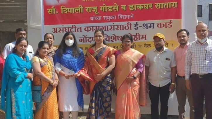 सातारा येथील पोस्ट ऑफिस सातारा जिल्हा व माजी उपनगराध्यक्ष सौ दिपाली राजू गोडसे यांच्या संयुक्त विद्यमाने सातारा येथील यादोगोपाळ पेठेत असंघटीत महिला व पुरुष कामगारांसाठी डाक घर भारत विभाग श्रम मंत्रालय केंद्र सरकार व प्रधानमंत्री आत्मनिर्भर भारत योजनेअंतर्गत समाजातील 24 प्रकारच्या असंघटित कामगारांसाठी श्रम कार्ड विशेष नोंदणी सप्ताह सुरू करण्यात आला आहे सात फेब्रुवारी रोजी यादोगोपाळ पेठेतील सातारा जिल्हा बाल विकास समिती येथे या योजनेचा शुभारंभ सातारा जिल्हा पोस्ट ऑफिस च्या प्रमुख अपराजिता मिथा सातारा शहर पोस्ट ऑफिस प्रमुख सविता दळवी पोस्ट विभागाचे माने साहेब बिचकर साहेब दीपा ढवळे माजी उपनगराध्यक्ष सौ दिपाली राजू गोडसे यांच्या हस्ते करण्यात आलायावेळी बोलताना अपराजिता मिथा असंघटित कामगारांसाठी सौ दिपाली राजू बोरसे यांनी पुढाकार घेऊन ही योजना एकाच ठिकाणी चालू केली याचा लाभ समाजात काम करणाऱ्या 24 प्रकारच्या असंघटित कामगारांना होणार असून 7 फेब्रुवारी पासून भारतातील प्रत्येक पोस्ट ऑफिस मध्ये ही योजना चालू करण्यात आली आहे तसेच या कार्ड च्या माध्यमातून कार्ड नोंद नोंदणी झाल्यानंतर सरकार तर्फे देण्यात येणाऱ्या सर्व योजना थेट असंघटित कामगारांना मिळणार आहेत दीपाली गोडसे यांनी राबवलेला उपक्रम अत्यंत कौतुकास्पद आहे