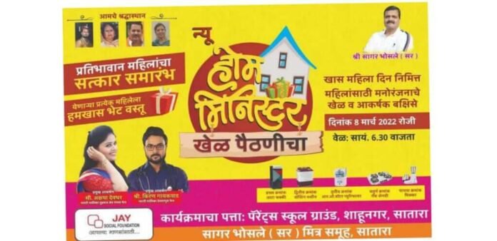खासदार श्री छ उदयनराजे भोसले यांचे कट्टर समर्थक व प्रसिद्ध व्यवसायिक सागर भोसले आणि त्यांचे सहकारी व जय सोशल फाउंडेशन यांच्या संयुक्त विद्यमाने शाहूनगर येथील पेरेंट्स असोसिएशन स्कूलच्या प्रांगणात होम मिनिस्टर कार्यक्रम रंगणार आहे जागतिक महिला दिनानिमित्त आठ मार्च रोजी सायंकाळी पाच वाजता हा कार्यक्रम होणार असून साताऱ्यातील मान्यवर महिलांचा यावेळी सत्कार करण्यात येणार आहे या कार्यक्रमाची माहिती जय सोशल फाउंडेशनच्या अधिकृत सूत्रांनी दिली