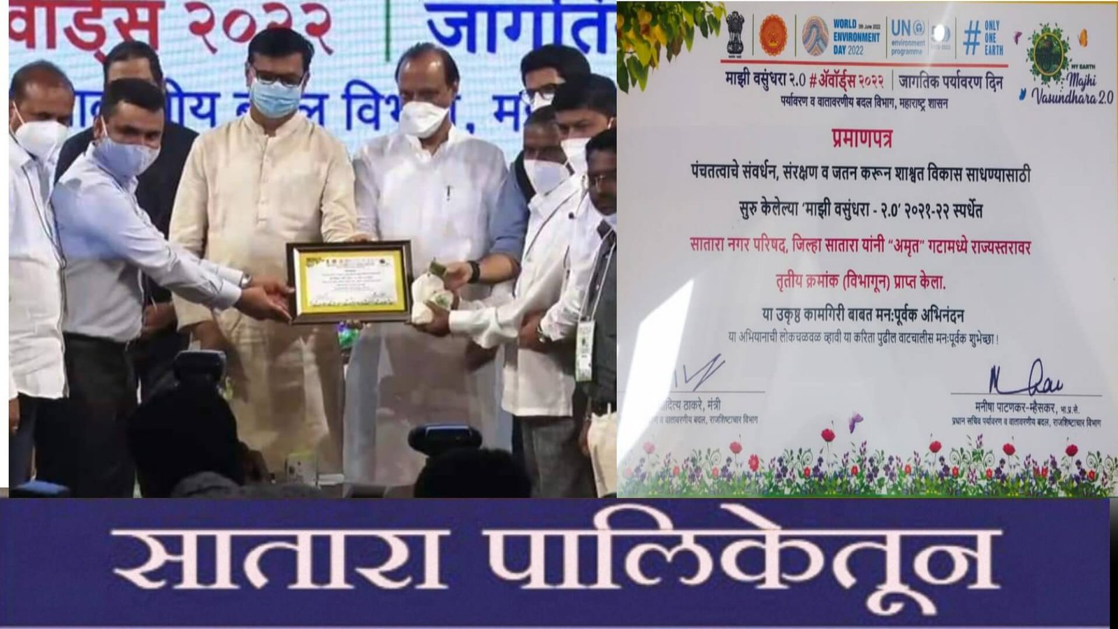 सातारा जिल्ह्यातील वर्ग असणाऱ्या एकमेव सातारा पालिकेने माजी व सुंदर अभियान स्पर्धेत अमृत योजनेमध्ये तिसरा क्रमांक प्राप्त केला पर्यावरण संवर्धनाच्या निमित्ताने सातारा पालिकेने जे विशेष नियोजन केले विशेषतः घनकचरा प्रकल्प उभारणी करून कचरा निर्मूलन प्रात्यक्षिक आणि त्याचे विलगीकरण हे उपक्रम यशस्वीरीत्या राबवले या वेगळ्या प्रकल्पाची दखल राज्य शासनाच्या पर्यावरण आणि हवामान बदल विभागाच्या वतीने घेण्यात आली त्यामुळे सातारा पालिका आणि पुणे महानगरपालिका यांची अमृत गटामध्ये तिसऱ्या क्रमांकासाठी निवड झाली या योजनेचे बक्षीस लवकरच नगर विकास विभागाच्या वतीने दिले जाणार आहे उपमुख्यमंत्री अजितदादा पवार यांच्या हस्ते मुख्याधिकारी अभिजित बापट यांनी या योजनेचे बक्षीस प्रमाणपत्र स्वीकारले