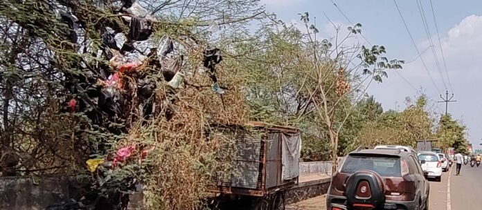 सातारा शहरात पालिके जवळील झाडावर कचऱ्याच्या पिशव्यांचे अफलातून झाड