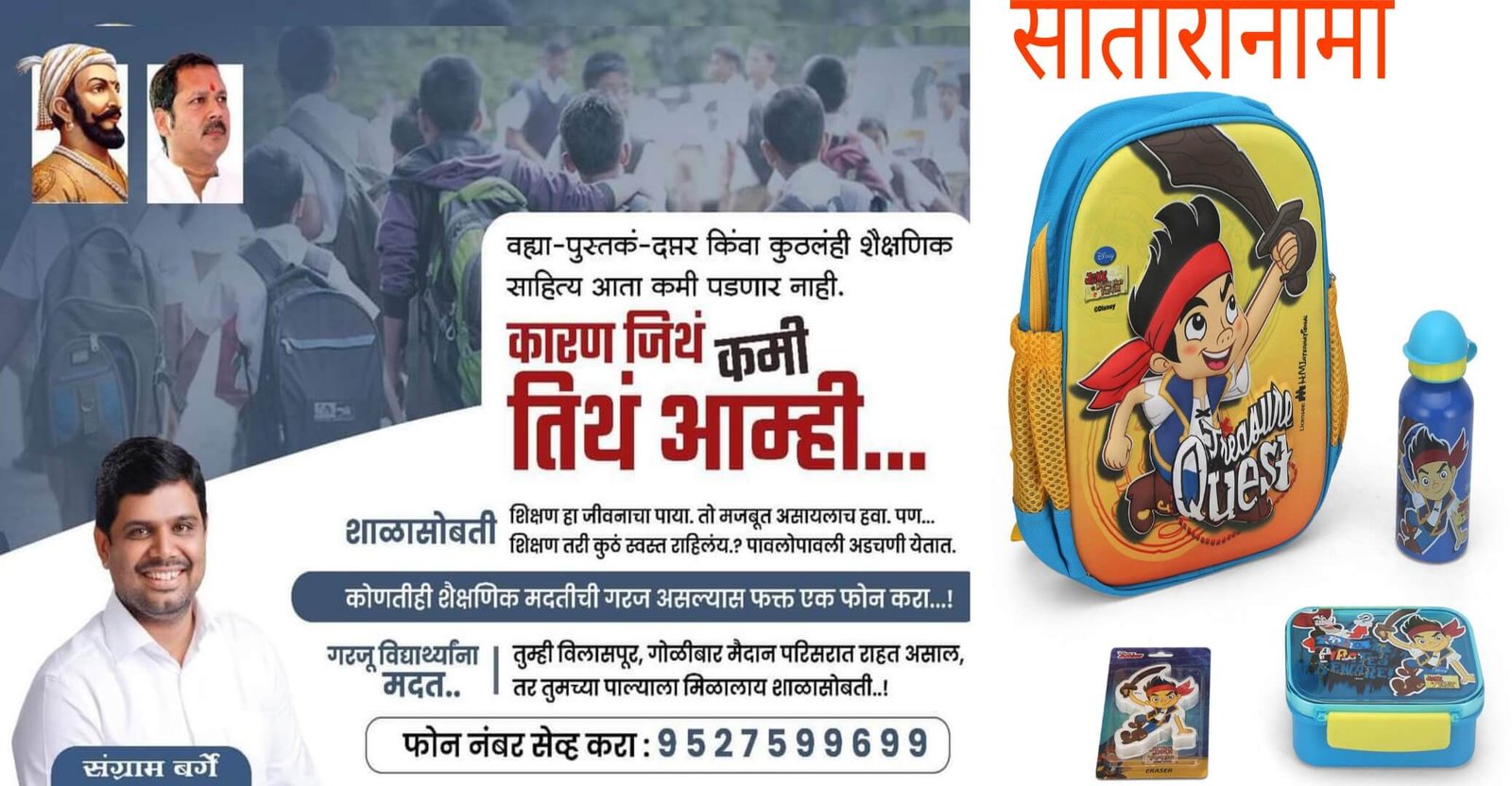 यंदा शाळांचे सत्र १५ जूनपासून सुरू होत आहे . बदललेल्या पाठ्यकमांच्या रचनेमुळे पुस्तके व इतर साहित्य बाजारात मागणीपेक्षा कमी उपलब्ध आहेत त्यामुळे विलासपूरचे उद्योजक व खासदार उदयनराजे भोसले यांचे समर्थक संग्राम बर्गे मित्र समूहाच्या वतीने विलासपूर गोळीबार मैदान परिसरातील गरजू विद्यार्थ्यासाठी शालेय साहित्य वाटप करण्यात येणार आहे .