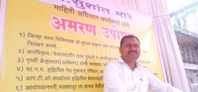 जिल्हा शल्य चिकित्सक डॉक्टर सुभाष चव्हाण यांच्या मनमानी व भ्रष्ट कारभार बाबत माने जिल्हाधिकारी यांनी संचालक आरोग्य विभाग मुंबई यांना चौकशीचे आदेश देणे कामी कारवाई करावी असे पत्र दिले आहेत अनधिकृत व बेकायदेशीर दारू दुकाने व विक्री प्रकरणी माननीय जिल्हाधिकारी यांनी राज्य उत्पादन शुल्क अधिकारी सातारा यांना चौकशीचे आदेश दिले गेल्याने उपोषण मागे घेत असल्याची माहिती सुशांत मोरे यांनी दिली