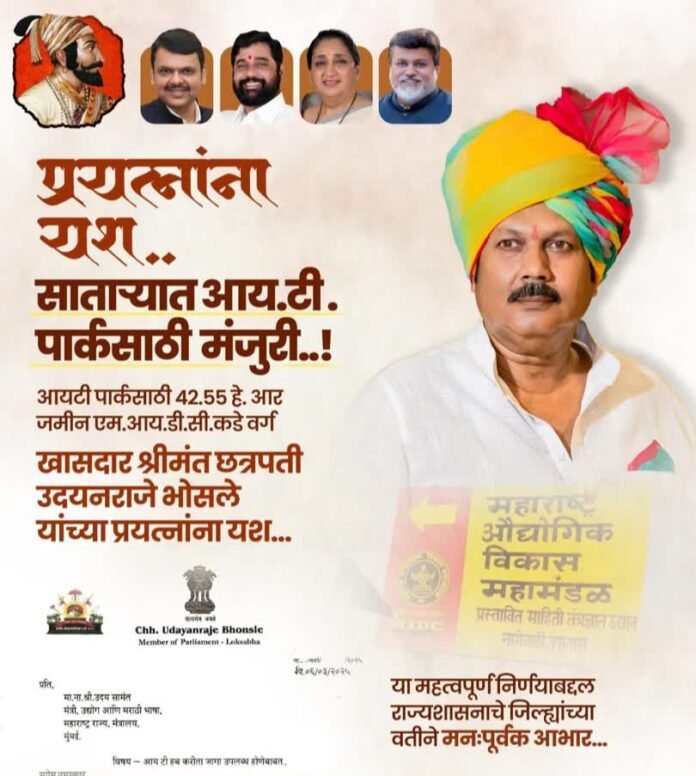 आली. या निर्णयाबद्दल आम्ही राज्यमंत्रीमंडळाचे सातारकरांच्या वतीने अभिनंदन करतो, आभार व्यक्त करतो,सातारकरांचे स्वप्न सत्यात आणण्यात आम्ही कोठे कमी पडलो नाही याचा अभिमान आहे अश्या शब्दात, खासदार श्रीमंत छत्रपती उदयनराजे भोसले यांनी आयटी पार्कला जागा उपलब्ध करुन देण्याच्या शासन निर्णयाचे स्वागत केले आहे.