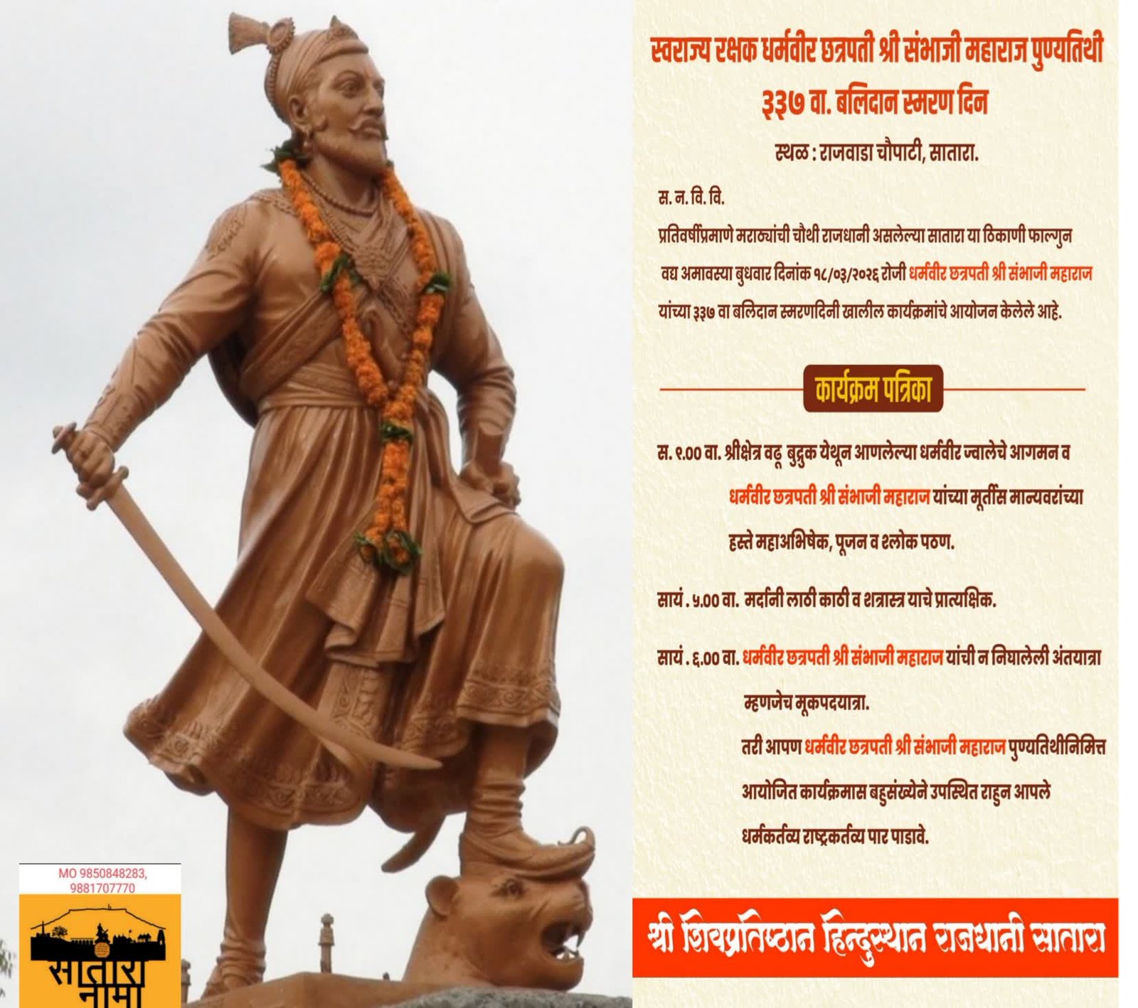 स्वराज्य रक्षक धर्मवीर छत्रपती संभाजी महाराज यांच्या 337 व्या बलिदान स्मरण दिनानिमित्त शिवप्रतिष्ठान हिंदुस्थान राजधानी सातारा यांच्या वतीने चौपाटी राजवाडा येथे विविध कार्यक्रमांचे आयोजन करण्यात आले आहे .सकाळी नऊ ते सायंकाळी सहा या दरम्यान धर्मवीर ज्वालाचे स्वागत मर्दानी खेळांची प्रात्यक्षिके मूक पदयात्रा असे कार्यक्रम होणार आहेत .