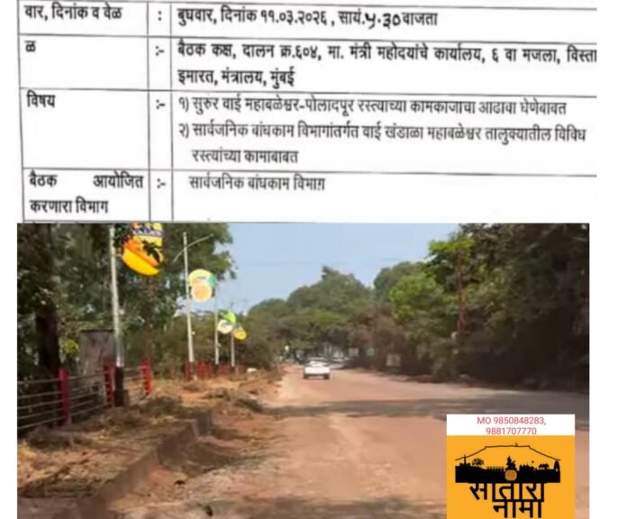 सुरूर वाई पाचगणी महाबळेश्वर रस्त्या प्रकरणी मंत्री मकरंद पाटील व प्रदेशाध्यक्ष शशिकांत शिंदे यांच्या दणक्याने सार्वजनिक बांधकाम मंत्री शिवेंद्रसिंहराजे भोसले यांच्या मंत्रालयातील दालनात आज सायंकाळी 5:30 वाजता बैठकीचे आयोजन करण्यात आले आहे